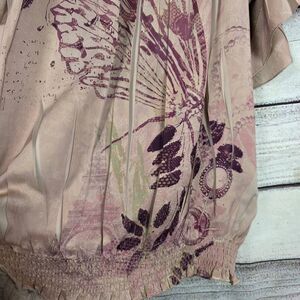 Christopher & Banks women’s blouse size Large in taupe with purple butterfly and leaf print. Features flutter sleeves, smocked hem, and elastic neckline for off-shoulder or scoop-neck styling. Lightweight and flowy 100% polyester fabric.