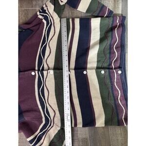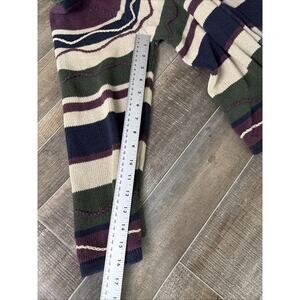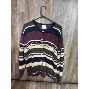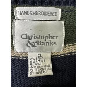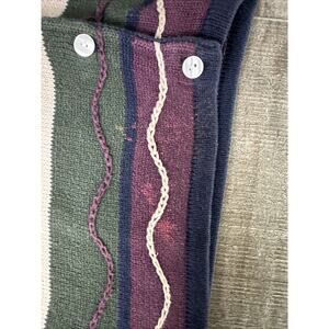 This Christopher Banks cardigan is a vintage piece featuring a striped multicolor design with hand embroidery details. Made of ramie and cotton in a tight-knit fabric, this long-sleeve sweater has a button front closure and is in size XL for women. Suitable for casual, business, or travel occasions, this colorful cardigan brings a unique and vibrant touch to your winter, fall, or spring wardrobe.