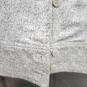 Upgrade your wardrobe with this stylish Christopher & Banks blazer-type jacket! Made with a blend of cotton, polyester, and spandex, this jacket features a trendy abstract pattern in white with brown-colored specks, shiny silver thread accents, and a button closure. The long sleeves measure 24-1/2 inches from shoulder to cuff hemline, and the jacket length is short 22-3/4 neckline to hemline. This blazer jacket is easy to maintain with hand wash only and it comes with pockets for convenience. The size is M and regular fit, suitable for the winter, fall, and spring seasons. Made in China, this basic jacket is a must-have for any fashion-forward woman and it will surely make a great addition to your collection! Chest measurement 21-1/4 pit 2 pit