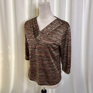 Christopher & Banks Earth Tone V Neck Blouse Metallic 3/4 Sleeve Women's PM Boho