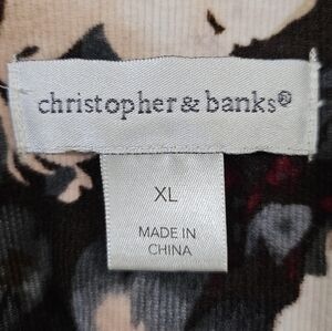 This is a Christopher & Banks floral corduroy jacket. It has a button-up front and a floral pattern in shades of red, white, gray, pink and tan. It can be worn as a jacket over a top or as a shirt. The jacket is machine washable.