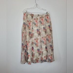 Stunning floral Midi Skirt with a chiffon floral printed overlay and a flowy lining. Cream, pink and blue color tones makes a dainty flattering look. Elastic waistband. Good condition. Tagged size large, fits oversized. Measures approximately 30 inches long 34 inches underarm to underarm laid flat.