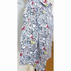 Lovely spring print with multi colored butterflies on a black and white floral background. 97% cotton, 3% spandex, machine wash/dry. Shirt feature: silver toned button closures, chest pockets with button closures, 3/4 length sleeves that roll up with silver toned button closures. Approx measurements laid flat: length 25" sleeves 17" chest (pit to pit) 22'.