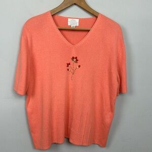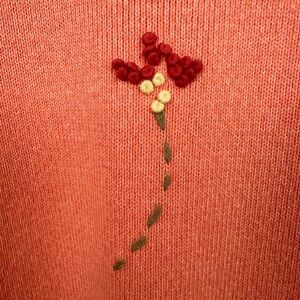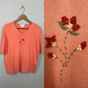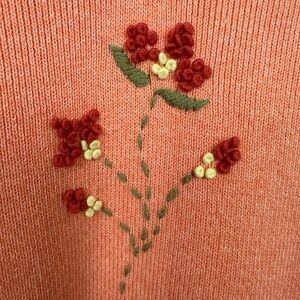 Beautiful coral/orange short sleeve V-neck sweater top with a delicate hand embroidered flower bunch at the front center and a single flower on the back. Seam details at the hem and sleeves. Truly a beautiful piece.