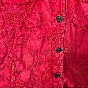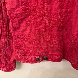 This wonderful lite red jacket is from Christopher & Banks. The item is embroidered with an excellent patter. The jacket is long sleeve with a button up front. This top is made out of 100% cotton. The size is large. The measurements are 23” L x 20” W (pit to pit) x 23” sleeve (shoulder to cuff). This jacket has been gently worn but is in very good condition.