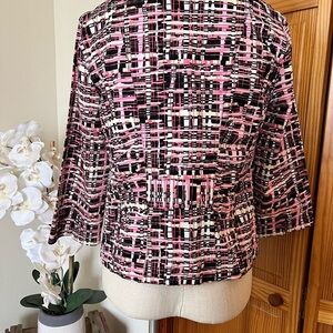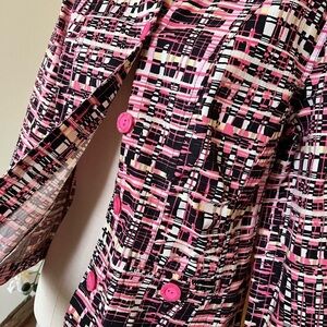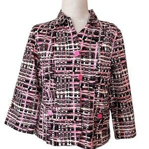 This Christopher & Banks button-up blazer jacket blends polished structure with playful charm. Featuring a vivid pink, black, and white woven print with large pink buttons, this piece is eye-catching and feminine. The 3/4 length sleeves are slightly flared and include a slit detail, while two front pockets add function and balance. The shorter silhouette makes this perfect for layering over dresses or pairing with high-waisted trousers or skirts. Armpit to armpit: 18.5 inches Length: 23.5 inches Condition: Excellent Materials: 98% cotton, 2% spandex church outfit, professional blazer, spring jacket, Easter outfit, office wear, pink blazer, colorful business attire, cottagecore, modest clothing, businesswoman style, careerwear, feminine layers, Barbiecore
