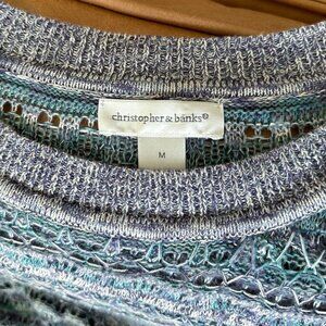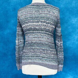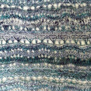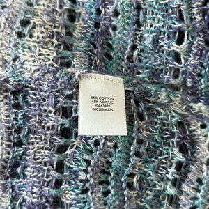 Nice breathable sweater with an open lace-like knit in soft aqua and purple shades.