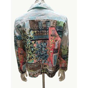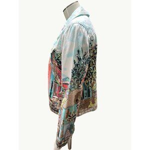 Christopher & Banks PM Stretch Jacket Colorful Town Print Button Up Front