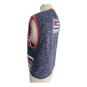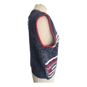 Stay stylish with this navy and red striped sweater vest. Perfect for layering and adding a pop of color to your outfit.