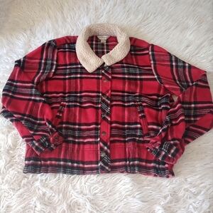 Stay cozy and stylish with this plaid red jacket featuring a soft sherpa collar. Perfect for adding a pop of color to your wardrobe.