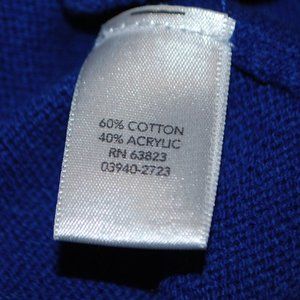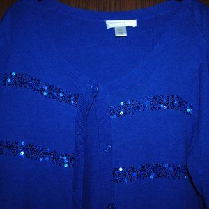 Looking for something that can be both casual and dressy? This pretty sapphire blue button-up cardigan features four rows of stripes in front of matching sequins. Features a rounded neckline and lightly banded sleeves. Cotton/acrylic and machine washable. By Christopher & Banks, size PXL.