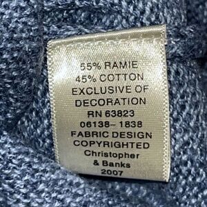 This lot of two Christopher Banks spring sweaters is the perfect addition to your wardrobe. Made from a comfortable cotton blend, these pullover sweaters are ideal for the cool spring weather. The blue color and garden design will brighten up any outfit. Available in women's size medium, these sweaters are perfect for any regular size type. Whether you're looking for a cozy sweater for a casual day out or a stylish addition to your gardening attire, these Christopher Banks sweaters are a versatile choice.