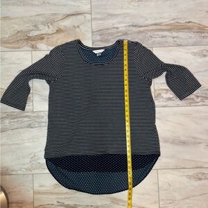 Chic meets classic in this Christopher & Banks high-low tunic top. Navy and white stripes pair perfectly with the polka dot chiffon-style hem and back contrast. Features 3/4 sleeves, scoop neck, and a flattering draped design with a stylish overlapping back detail. Lightweight, soft, and perfect for year-round layering.