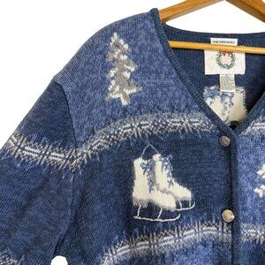 Vintage Christopher & Banks winter cardigan in soft blue tones with hand-embroidered snowflakes, pine trees, and ice skates.