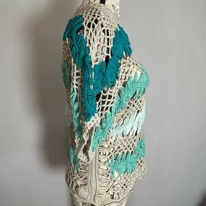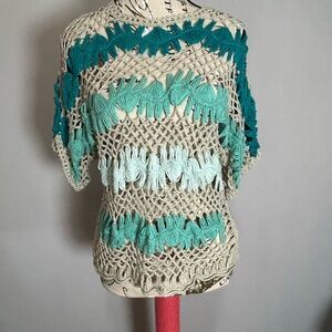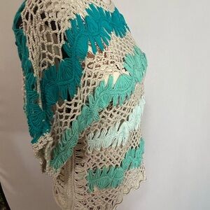 Elegant crochet top with teal and cream design. Ideal for layering. Medium