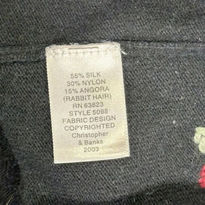 This Christopher Banks vintage women's sweater in size XL features a floral pattern with beaded accents on a tight-knit fabric made of silk, nylon, and angora. The round neckline and straight sleeves give a classic fit, perfect for any occasion from travel to casual wear or even a party/cocktail event. The black sweater is an ideal addition to any wardrobe and has a unique touch of vintage style, making it a perfect fit for those who love cottagecore, grandmacore, or even Y2K fashion. It's a must-have for anyone who wants to enjoy the whimsy goth, 80s, 90s, or preppy styles with a touch of flower theme. This sweater is perfect for colder seasons like winter, fall, and spring.