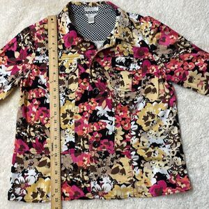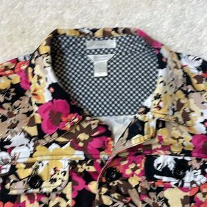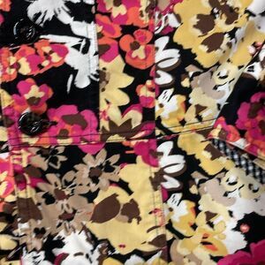 Christopher Banks woman’s button down lightweight jacket. Multicolor of brown tan pink floral bold print. Form fitting. Stretch material. Wear as a jacket/blazer or wear alone. Excellent use condition. No stains. No holes or tears. Smoke free home. Fast shipping. Open to offers