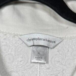 This Christopher & Banks denim jacket features delicate eyelet embroidery on the shoulders and collar, adding a subtle touch of charm to a classic white jean jacket. Made from comfortable stretch denim, it layers beautifully over dresses, tees, or tops for spring and summer styling.