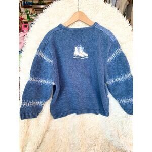 I love the colors on this one! They’re so fun and super wintery so it could be worn after Christmas as well. Marked large and looks 1-2 sizes bigger than a 5/6 cardigan I compared it to. The sleeves appear to be short, but I believe since it's drop shoulder they would fit normally, however please refer to measurements.