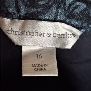 Christopher & Banks, Women 16, Denim Rosette Floral Design with Various Denim Washes-- Button/Zipper Closure, 5 Functional Pockets, Lightweight Stretch Knit Short Underneath Denim Skirt Overlay (skort)