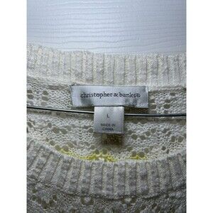 The Christopher & Banks Women's Long Sleeve Striped Sweater in white and yellow, size large, is a versatile and stylish addition to any wardrobe. This open-knit sweater features a classic crew neck and long sleeves, making it perfect for various occasions such as casual outings, workwear, or formal events. Made from 100% cotton, this lightweight and breathable sweater is easy to care for with its machine washable design. With its regular fit and pullover style, this sweater offers comfort and style throughout the year.