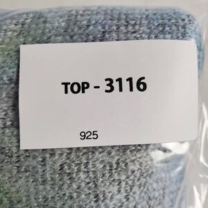 Soft knit sweater in a subtle multicolor pastel print with light blue, pink, yellow, and green accents on a heather gray base. Features crew neckline and long sleeves. Fabric: 73% acrylic, 27% polyester. Size Medium.