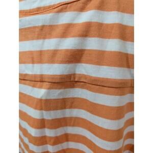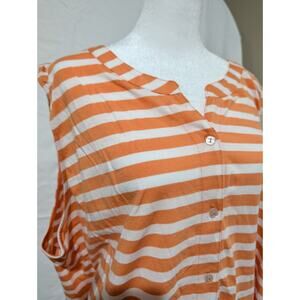 The Christopher & Banks Women's Plus Size 3X Sleeveless Striped Shirt Tank Top is a stylish and versatile addition to any woman's wardrobe. Made from a comfortable cotton blend material with a regular fit, this top features a flattering V-neckline and a sleeveless design. The orange and white stripes add a pop of color to the classic button-up style, making it perfect for any occasion. With its breathable fabric and collarless design, this top is both practical and fashionable for everyday wear.