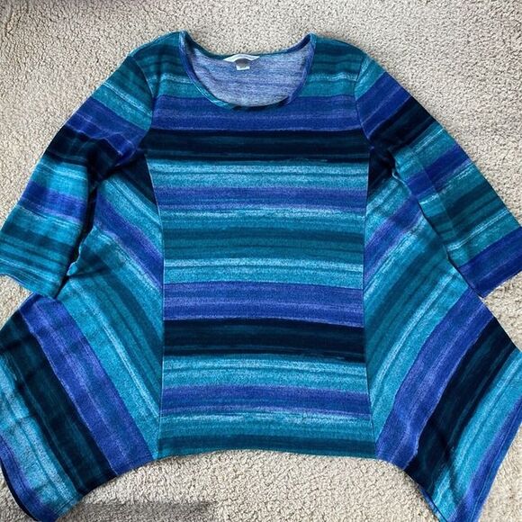 Christopher & Banks Women's Sz L Greens Blues Stripe Hi Lo Hem Long Sleeve Top
