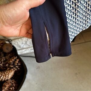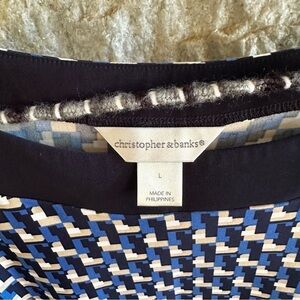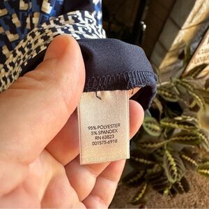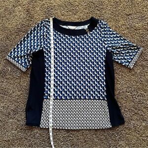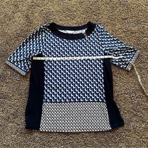 Beautiful blue geometric print blouse with metal hardware detail at the neckline. Excellent used condition! Great stretch and length. The short sleeves are about elbow length, very flattering fit. Size large. Message with any questions!