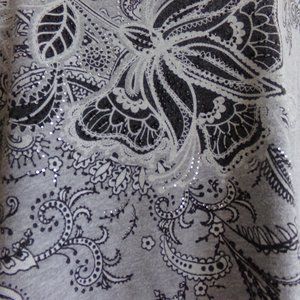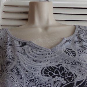 Nice Christopher & Banks gray knit 3/4 sleeve top size L EUC This has a pretty pattern on the front with crystals scattered over it.