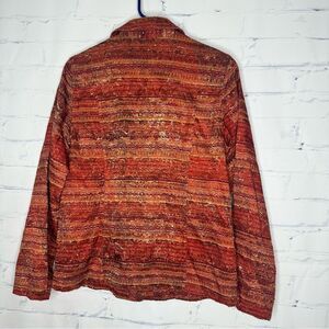 Great condition and love it. No pockets and could be a light jacket maybe. Armpit to armpit is 20 inches and the length is 24 inches. It buttons up.