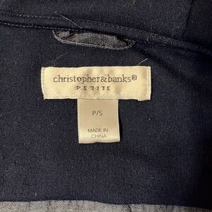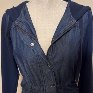 Christopher & Banks navy jacket with hood. Snap front and zipper front. Lower front pockets . Adjustable elastic waist. Sweater fabric sleeves and inside hoodie. Size PS