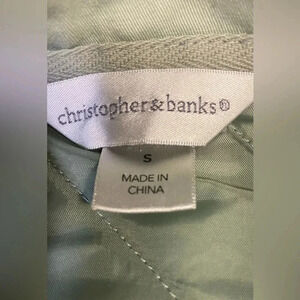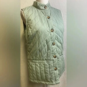 This Christopher & Banks quilted button quilted vest has outer pockets, and button down closure. This is a women’s size small in a mint green, light green color, at times in different light can have a light blue hue to it. Excellent condition, Preowned.