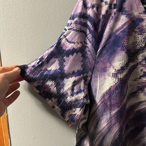 Excellent used condition. Beautiful purple geometric pattern t shirt with bedazzled detail. Size X (14W). There is a minor ribbed pattern to the fabric. Super soft and comfy!
