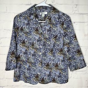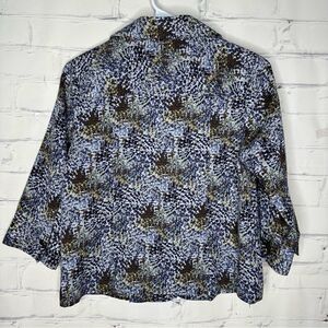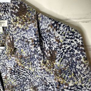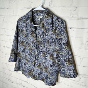 Great condition and love it. It says petite but anyone can wear it I would think. Snap buttons. Armpit to armpit is 19 inches and the length is 20 inches.