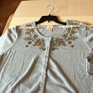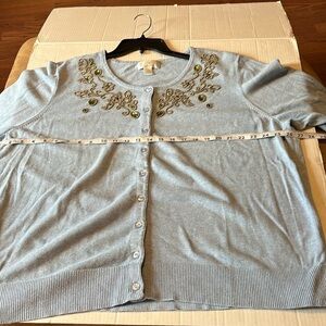 Christopher& Banks-2X-baby blue-button up, 3/4 sleeve, beaded and jeweled embellished, cardigan sweater. rib detail on sleeves and bottom. 100% cotton. See photos for approximate flat measurements.