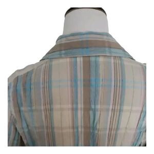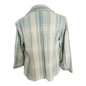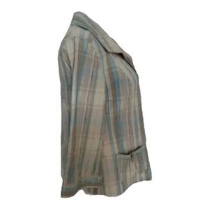 Christopher & Banks Stretch Women's 98% Cotton, Light Brown, Pink and Blue Plaid Pattern, Button Up, 3/4 Sleeve, Side Pockets Crinkle Blazer Size L. Great Pre-owned Condition with no visible defects, tears or stains. For material and care see pictures please.