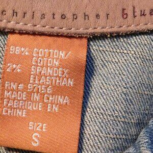Christopher Blue Denim Blue Jean jacket. Embroidered, size Woman's small. Machine washable, cotton/spandex