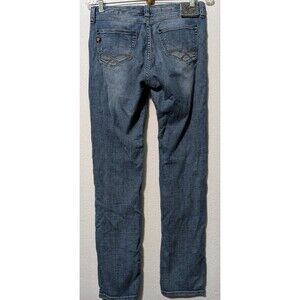 The Christopher Blue Women's Stretch Denim Straight Jeans in size 6 are a stylish and versatile addition to any wardrobe. Made from a comfortable cotton blend fabric with a medium wash, these slim-fit jeans feature a classic zip and button closure and a mid-rise waist. The solid blue color and embroidered logo accents give them a trendy look, while the stretch denim material ensures a comfortable and flattering fit. Perfect for all seasons, these vintage-inspired jeans can be easily machine washed for convenience.