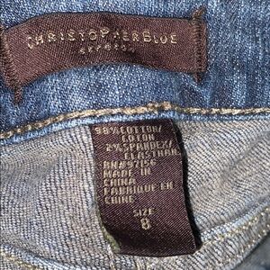 Christopher Blue cuffed cropped jeans capris size 8. Great condition see photos for details. Approximate measurements laying flat 15” waist 8” rise 22” inseam. 98% cotton 2% spandex.
