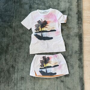 Stylish t-shirt with a tropical palm tree print. Features shades of pink, orange, and black on a white background.