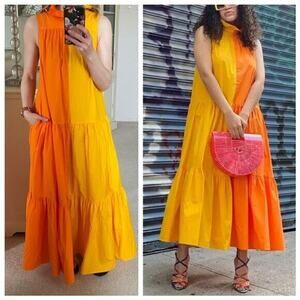 This stunning Christopher John Rogers Target dress is perfect for any occasion. The high-neck, sleeveless dress features a beautiful colorblock pattern with an orange and yellow combination. The long, tiered maxi dress is made of poplin fabric and includes a stylish ruffle accent.