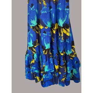In a burst of vibrant colors and bold artistry, this Christopher John Rogers maxi dress exudes elegance. Its flutter sleeves and flowing tiered skirt whisper of carefree summer days, while the abstract print tells a story of creativity and individualism. Perfectly tailored to grace any wardrobe with its striking charm.