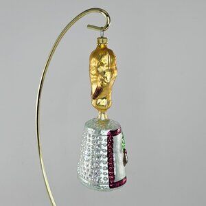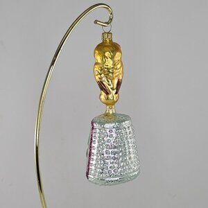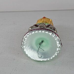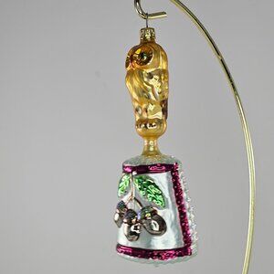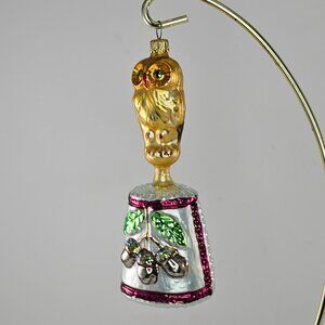 A charming vintage glass ornament featuring an owl atop a berry-adorned bell. Adds a whimsical touch to holiday decor with its intricate details.