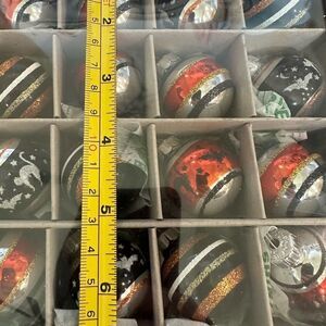 NWT Christopher Radko Shiny Brite 20-ct. vintage style glass Halloween orange black and silver glitter striped mini ball ornaments set with cats moon and stars. Multiple boxes and styles available, bundle and save on shipping!