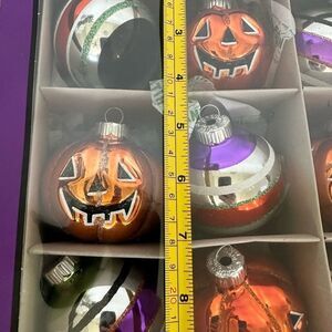 NWT Christopher Radko Shiny Brite 9-ct. vintage style glass Halloween orange green purple black and silver glitter striped ball and pumpkin jack o lantern shaped ornaments set. Multiple boxes and styles available, bundle and save on shipping!