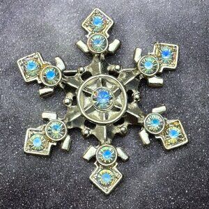 This snowflake-shaped brooch features shimmering blue rhinestones with a silver-tone finish, adding a chic touch to winter or festive attire.