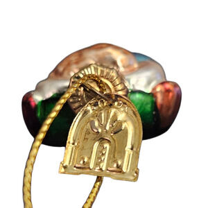 Beautiful Christopher Radko “Sweet Dreams” hand-blown glass ornament depicting a sleeping child tucked under a glittered blanket. Features Radko’s signature hand-painted details in gold, purple, aqua, and green with a shimmering finish.