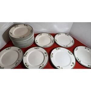 Elevate your holiday table settings with the Traditions Holiday Celebration by Christopher Radko collection. This includes 22 round ceramic plates, beautifully adorned with a holly berry and leave pattern in a classic white, green, and red color scheme. These plates measure 8 1/4” in diameter, perfect for both salad and dessert courses.