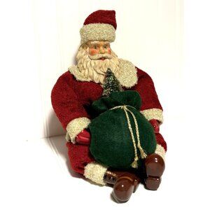 This is a Christopher Radko Shiny Brite Santa Claus figurine. It is a wind-up music box that plays "Santa Claus is Coming to Town" while the Santa figure nods its head. The head, hands, and boots are made of ceramic or porcelain, and the outfit is soft fabric.